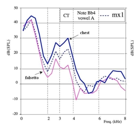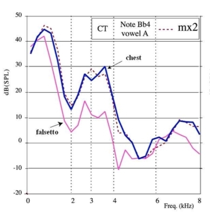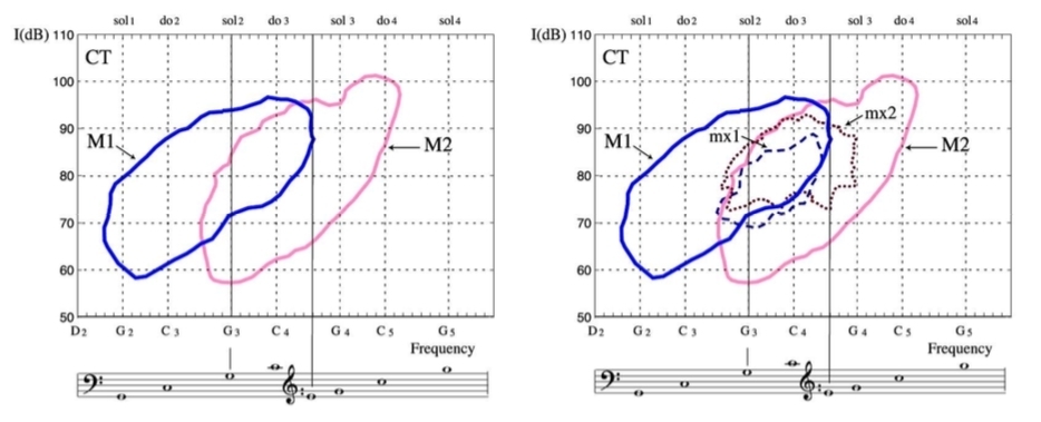 Если вы попросите опытного певца воспроизвести звуки на одинаковой частоте в Микс 1 и Микс 2, вы заметите, что звук Микс 2, как правило, имеет меньшую интенсивность (условно громкость). Однако, каким бы искусным ни был певец, существуют некоторые тембральные различия между звуками Микс 1 и Микс 2, при этом наблюдается большее гармоническое богатство, особенно в диапазоне 4–8 кГц, у звуков Микс 1.