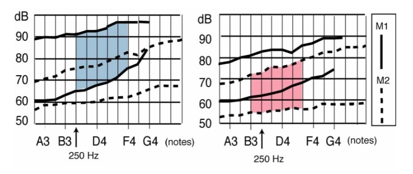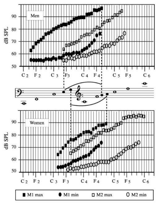 Из анализа фонетограмм, проведенного среди певцов и певиц, можно заметить, что область M1 в среднем больше у мужчин, тогда как область M2 в среднем больше у женщин. Однако область перекрытия M1 и M2 одинакова по амплитуде и частотному диапазону для обоих полов.